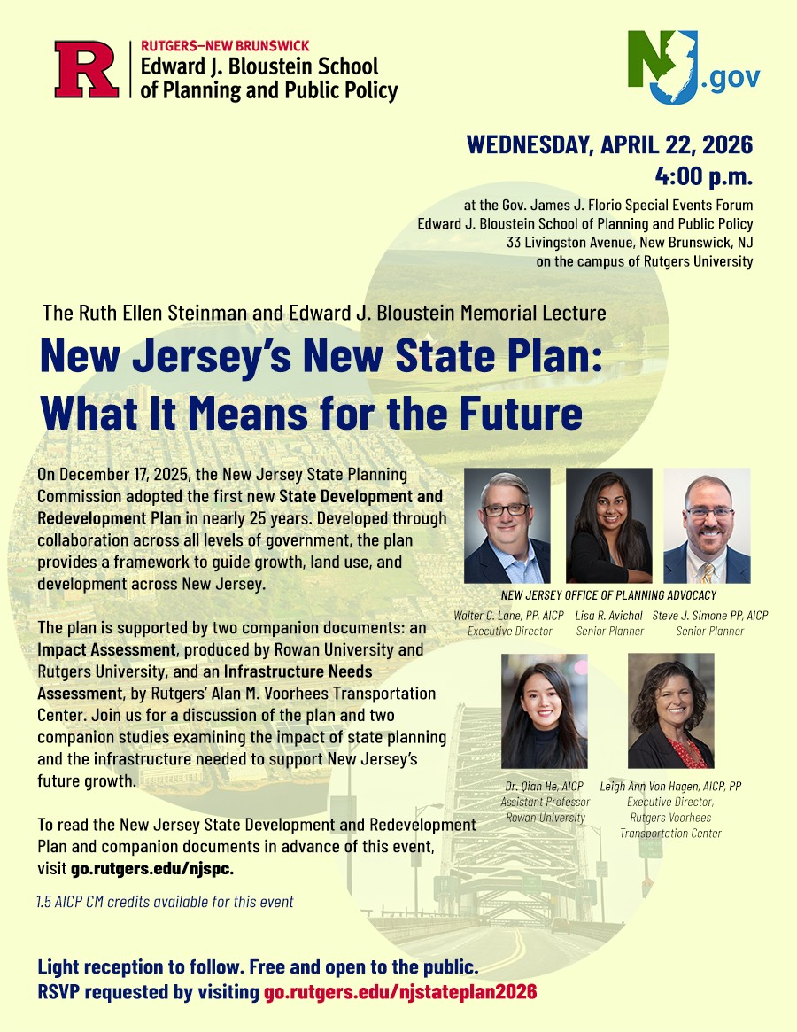 This event is presented by the Edward J. Bloustein School of Planning and Public Policy, with support from the New Jersey Office of Planning Advocacy.